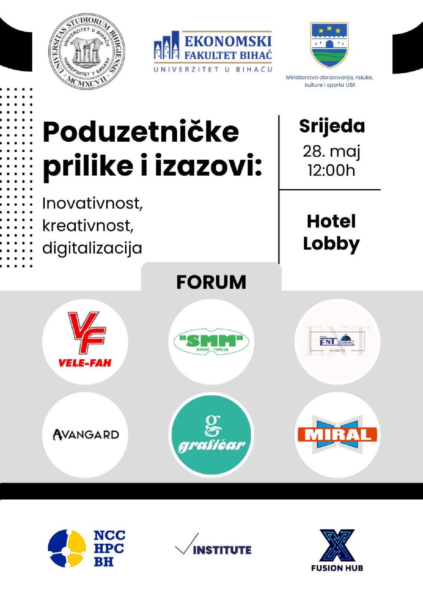 Forum Ekonomskog fakulteta Univerziteta u Bihaću pod nazivom „Poduzetničke prilike i izazovi: Inovativnost, kreativnost, digitalizacija“ održat će se u srijedu, 28. maja 2025. godine u kongresnoj sali hotela Lobby u Bihaću, s početkom u 12:00 h.