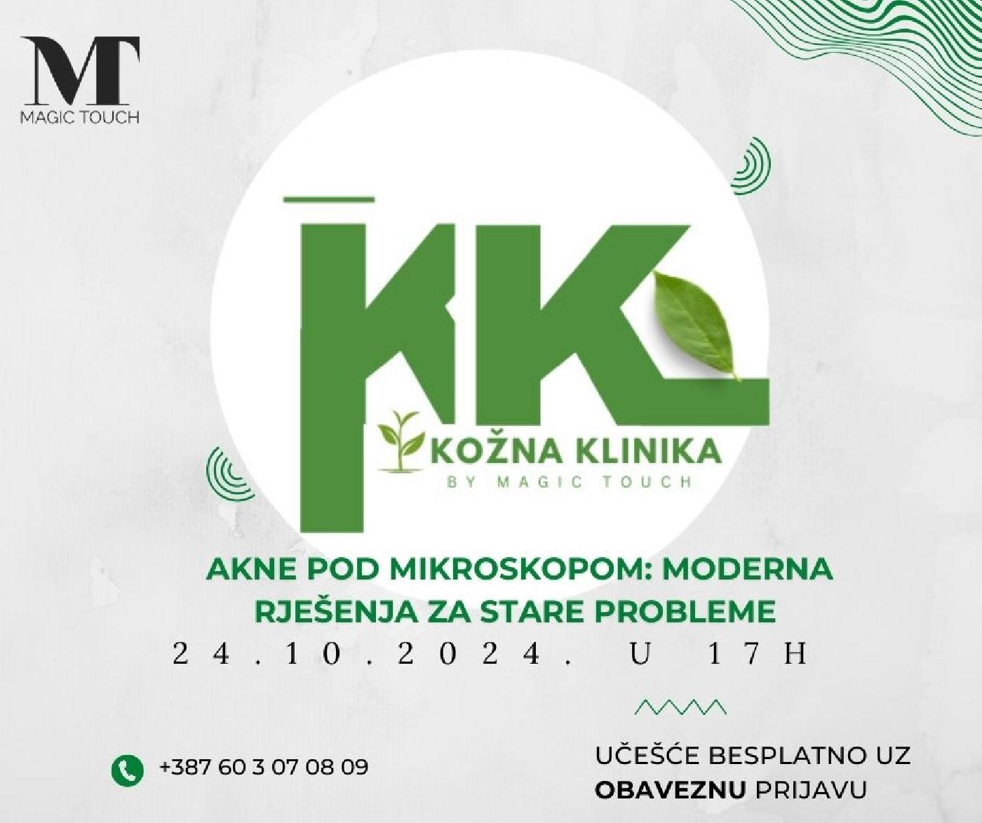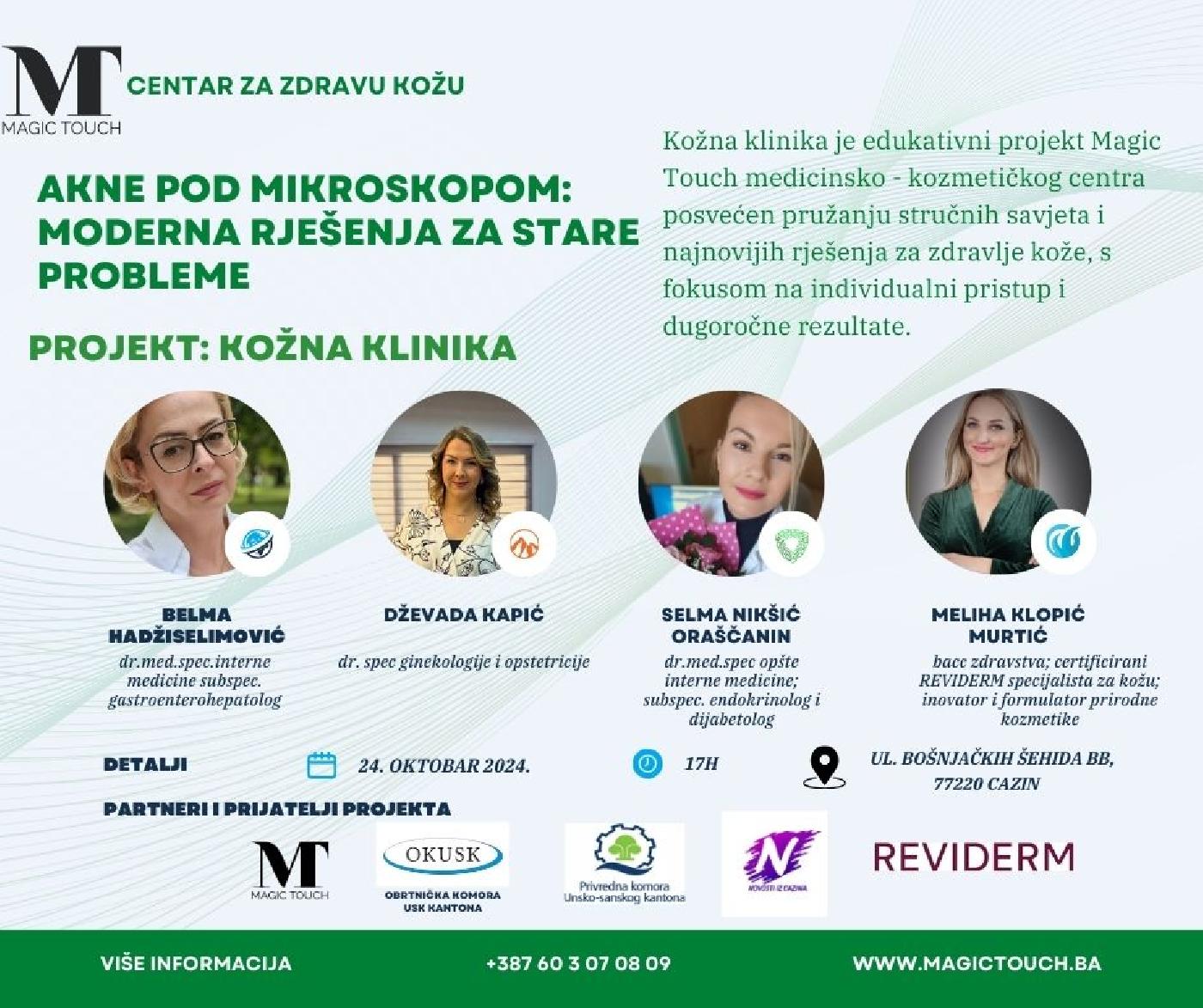 Magic Touch medicinsko-kozmetički centar iz Cazina već dugi niz godina predano radi na podizanju svijesti o važnosti njege kože i zdravlja. S velikim zadovoljstvom Vam želimo predstaviti njihov novi projekt, “Kožna klinika”, koji je osmišljen s ciljem edukacije šire javnosti o značaju pravilne njege kože, liječenja problema poput akni, rozacee, kuperoze, neurosenzitivnosti, zaštite od sunčevog zračenja te prevencije ozbiljnih bolesti poput tumora kože.