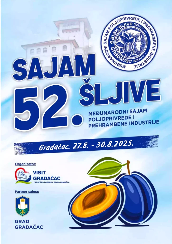 Privredna komora Unsko-sanskog kantona poziva članice da se prijave za zajednički nastup privrede USK na 52. međunarodnom sajmu poljoprivrede i prehrambene industrije "Sajam šljive" koji će biti održan od 27. do 30. augusta 2025. godine u Gradačcu.